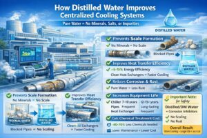 Centralized cooling systems are an efficient solution for cooling large buildings. Using distilled water in these systems helps prevent scaling, corrosion, and performance loss. As a result, the system delivers consistent cooling, consumes less energy, and requires less maintenance.