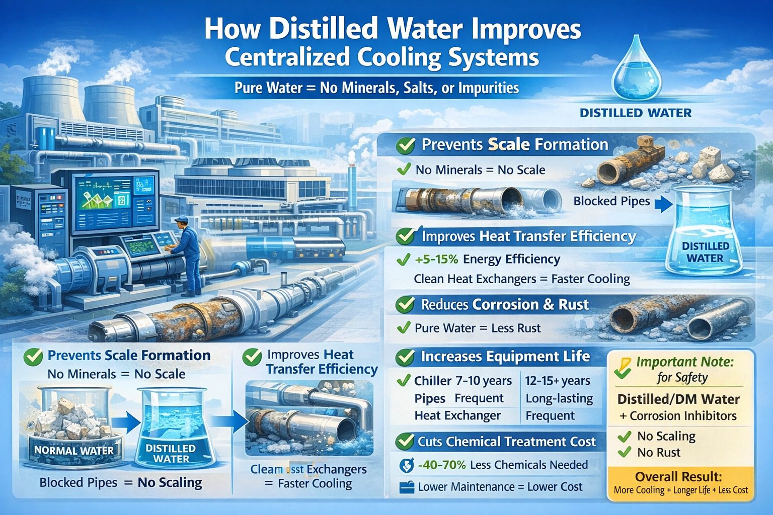 Distilled water is therefore a smart and reliable choice for centralized cooling systems.