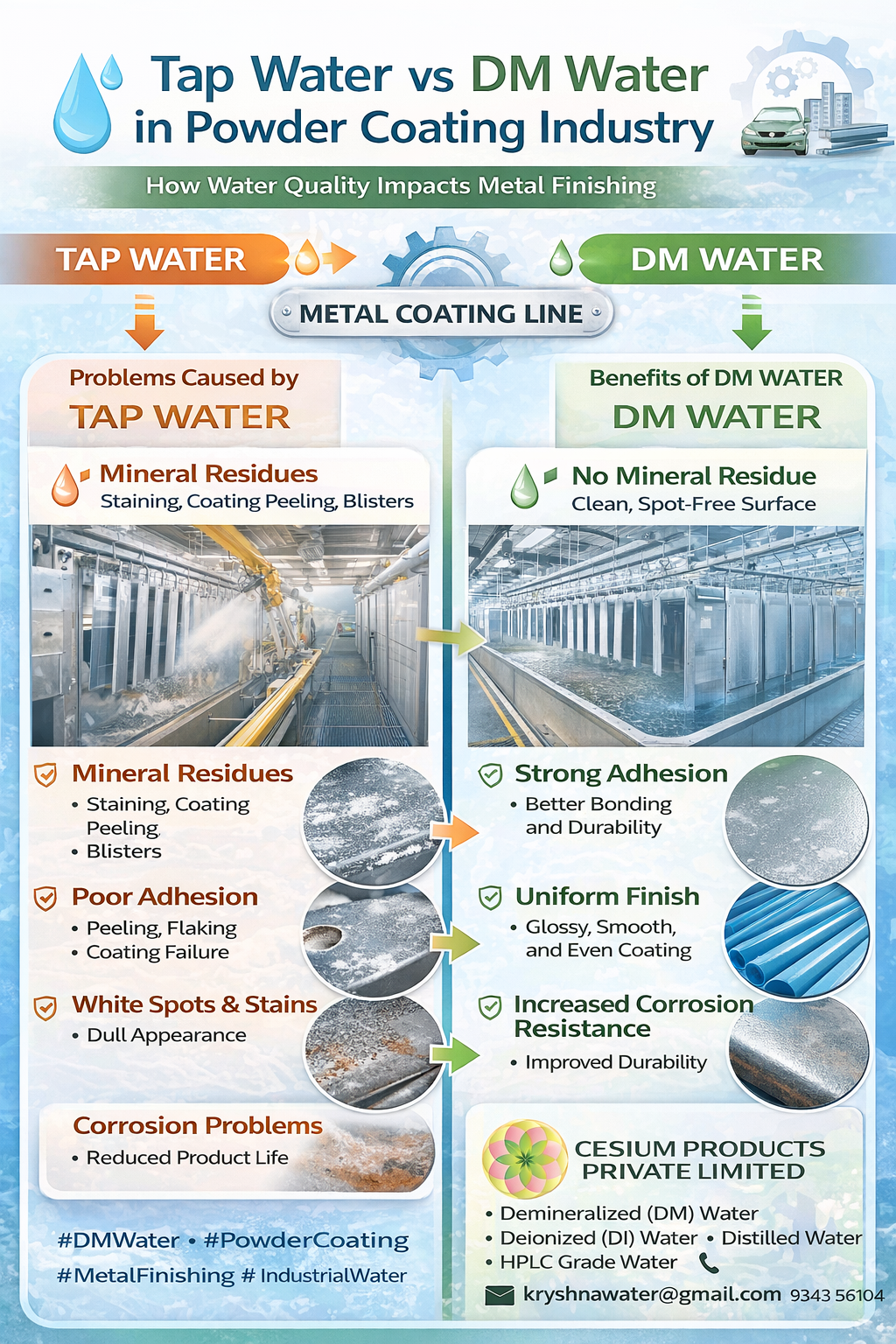 Switching to Demineralized (DM) water eliminates these contaminants, improves coating adhesion, enhances finish quality, and significantly increases corrosion resistance.